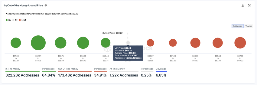 인 더 머니 주소는 현재 가격보다 낮은 가격에 AVAX를 구매한 주소로, 현재 수익성 있는 위치에 있음을 의미합니다. Out-of-the-Money 주소는 더 높은 가격에 구매하여 현재 손실을 보고 있는 주소입니다.