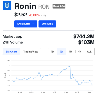 이번 주 초 암호화폐 거래소 바이낸스 상장이 발표된 후 RON 가격이 폭락했습니다. 공동 창립자 하이 예는 RON 가격 폭락의 원인을 상장 전 블록체인에 토큰이 쌓이는 것을 지켜본 커뮤니티 탓으로 돌렸습니다. 2024년 1월 16일, 난센은 로닌의 월간 활성 주소가 192.2%로 가장 높은 증가율을 보였다고 밝혔습니다.