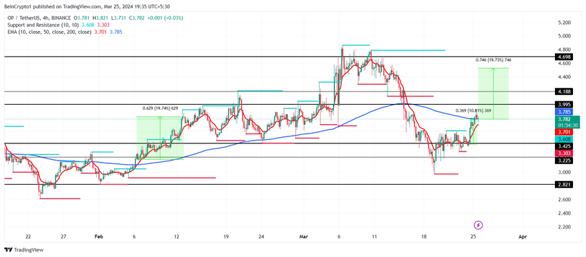 이 글을 쓰는 시점에 3.78달러에 거래되고 있는 옵티미즘 가격은 지난 24시간 동안 10.81% 상승한 후 반등하고 있습니다. 단기적으로는 투자자들에게 상당한 수익을 안겨주며, 앞으로 오지 않을 수도 있는 추가 상승에 대비하고 있습니다.