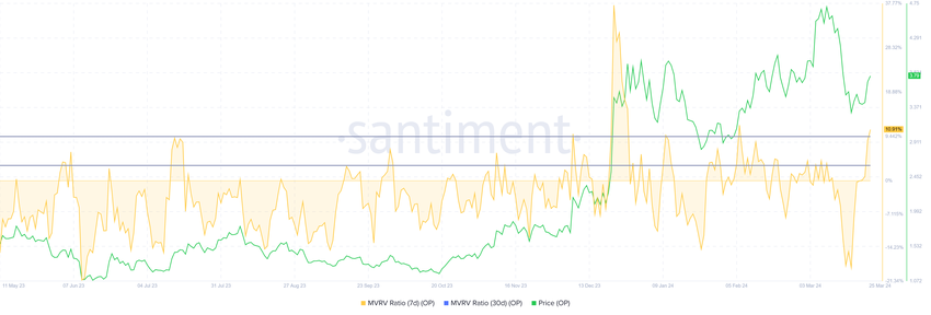 옵티미즘의 MVRV가 10.16%라면 최근 매수자의 수익이 10.16% 증가하여 매도할 가능성이 높다는 뜻으로, 잠재적인 하락을 의미합니다. 3~9% 사이의 MVRV는 영업이익의 위험 구간을 의미하며 조정 가능성을 암시합니다.