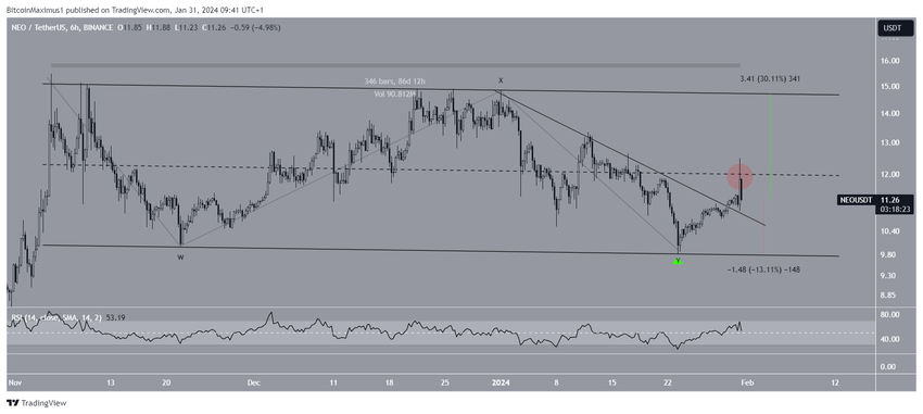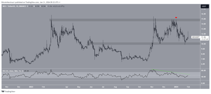 이 영역은 여러 차례 거부를 일으켰으며, 가장 최근의 거부는 2024년 1월 1일에 발생했습니다. 1월 23일 9.80달러로 최저점을 찍으며 하락세가 절정에 달했습니다. 이후 NEO 가격은 반등했으며 이후 상승했습니다 (녹색 아이콘).
