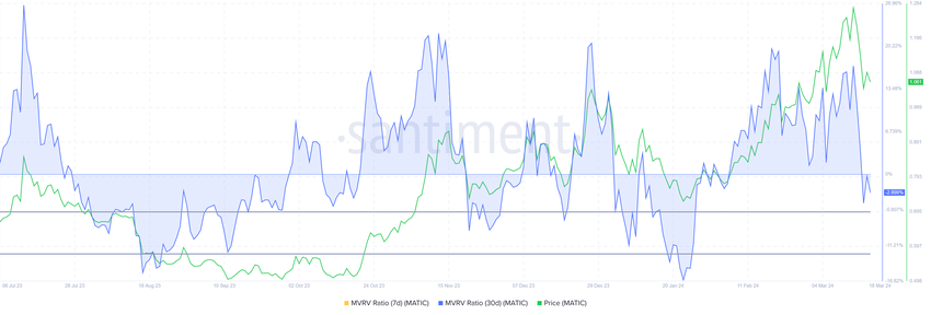 특히 30일 MVRV 비율은 전월에 자산을 획득한 투자자의 평균 수익 또는 손실을 평가합니다. 예를 들어, 폴리곤의 경우 30일 MVRV 비율이 -3%라면 지난달에 MATIC을 매수한 투자자가 현재 3%의 손실을 보고 있다는 뜻입니다.