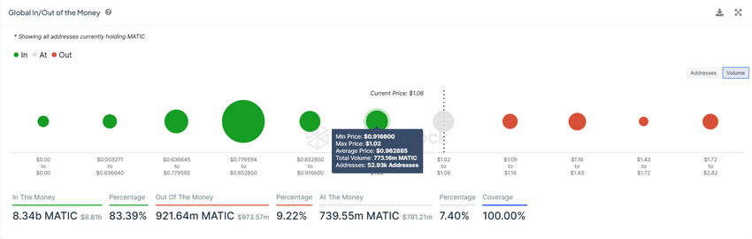 그러나 약 7억 7,300만 개의 MATIC에 의해 형성된 너무 많이 하락하는 데상당한 저항이 있을 것입니다. 8억 1,900만 달러 상당의 공급량은 평균 0.96달러에 자산을 구매한 투자자들이 매입했습니다.