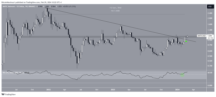 주간 시간대 움직임은 2023년 10월 이후 MATIC이 상승 했음을 보여줍니다. 2주 전, 상승 움직임은 사상 최고치 이후 존재했던 장기 하강 저항선에서 돌파를 촉발했습니다. 돌파 당시 추세선은 780일 동안 유지되고 있었습니다.