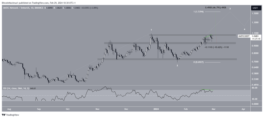 가장 가능성이 높은 카운트는 MATIC 가격이 5파 상승의 3파에 있음을 시사합니다. 파동 1과 3의 비율을 1:1로 계산하면 1.55달러에 가까운 고점을 형성할 수 있습니다. 이 고점에 도달하려면 47%의 MATIC 상승이 필요합니다. 하지만 MATIC이 저항선인 1.05달러 아래에서 거래되고 있기 때문에 가격 움직임은 결정되지 않았습니다.