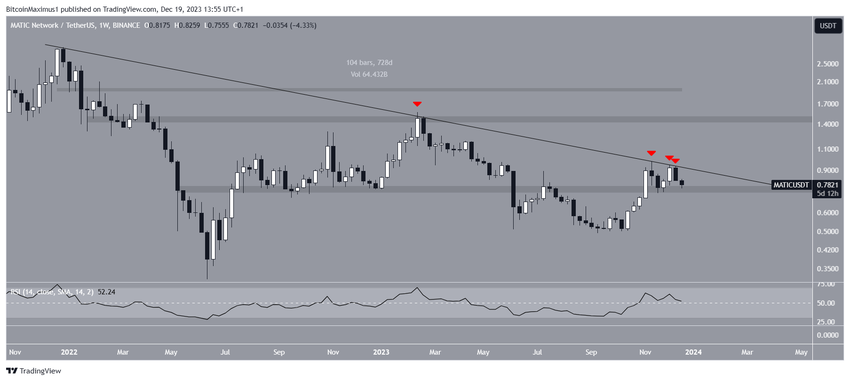 주간 시간대 기술적 분석에 따르면 MATIC은 2022년 사상 최고치를 기록한 이후 하강 저항 추세선 아래에 있는 것으로 나타났습니다. 지금까지 이 추세선은 거의 730일 동안 유지되고 있습니다. 가장 최근인 지난 주에도 여러 차례 이를 확인했습니다.