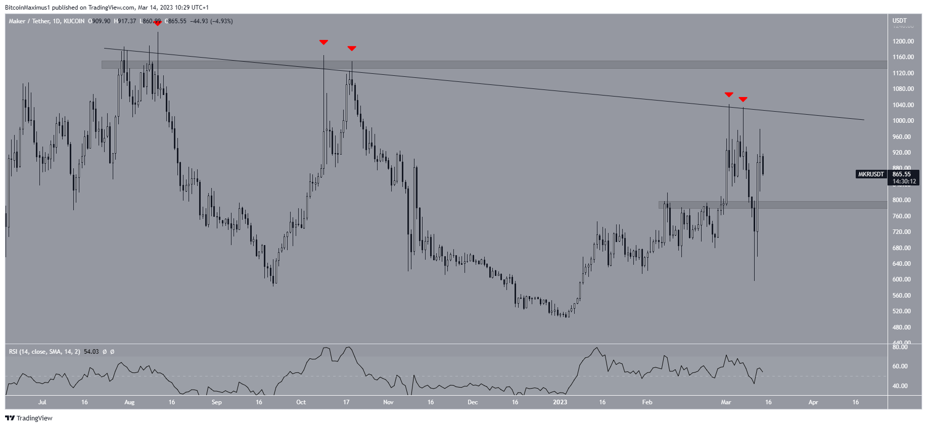 MKR이 8월 이후 하강 저항선 아래로 떨어졌기 때문에 일별 타임프레임의 기술 분석도 비슷한 수치를 보여준다. 이 저항선에서 가장 최근인 7일 여러 번의 거부(빨간색 아이콘)가 있었다. 처음에는 급격한 매도가 있었지만, 바로 반등하여 790달러의 수평 영역을 되찾았고, 이는 다시 지지선의 역할을 할 것으로 보인다.