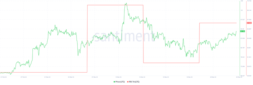 라이트코인 RSI는 지난 2주 동안 눈에 띄는 상승세를 보이며 60에서 현재 수준인 67까지 올랐습니다. 상대강도지수(RSI)는 자산의 상대적 강도를 측정하고 잠재적 전환점을 정확히 파악하는 데 유용한 도구입니다.