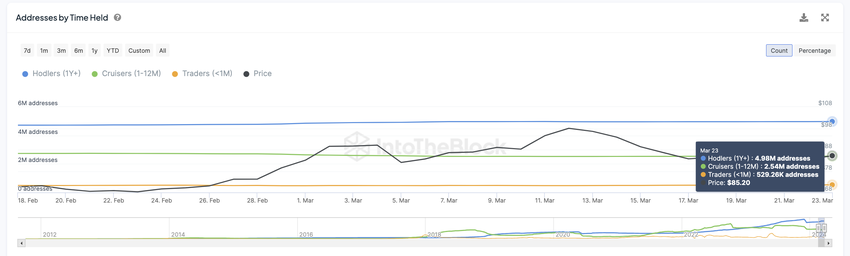 그러나 이러한 단기 보유의 급증에는 잠재적인 단점이 있습니다. 중기 보유자, 즉 ‘크루저'(한 달 이상 1년 미만 보유자)는 후퇴 조짐을 보이고 있습니다. 이 인구 통계는 같은 기간 동안 274만 명에서 254만 명으로 감소했습니다.