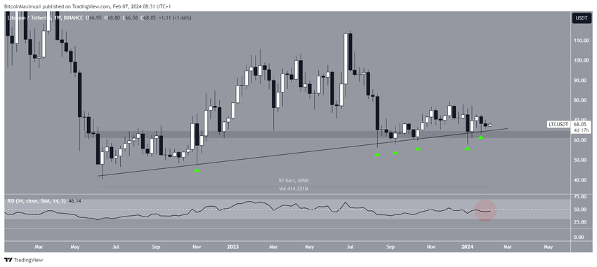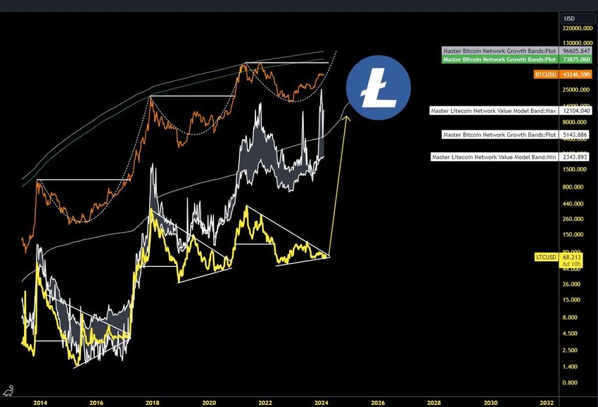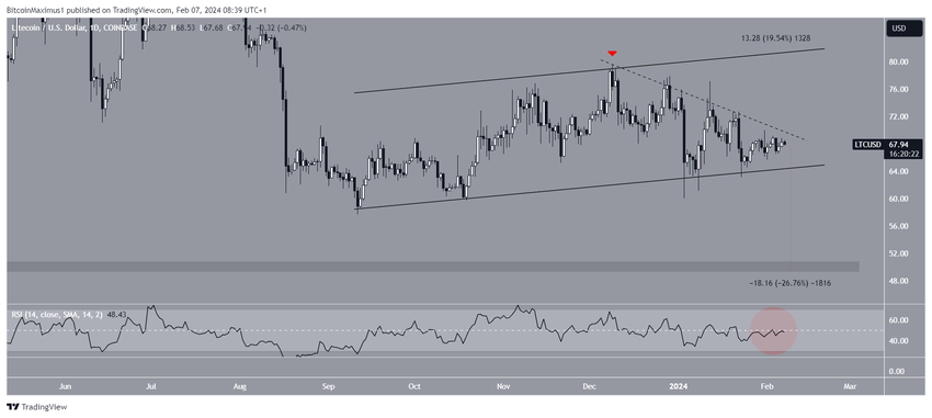 차트에 따르면 LTC는 2023년 9월 이후 오름차순 병렬 채널에서 거래되고 있습니다. 이러한 채널에는 일반적으로 조정 움직임이 포함되며, 이는 고장이 예상됨을 의미합니다.