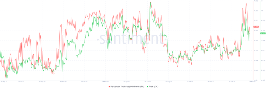 성장 잠재력을 나타내는 가장 중요한 지표는 수익에서 공급이 차지하는 비율입니다. 이 지표가 임계치인 95%를 넘거나 전체 라이트코인 유통량 중 95%가 수익이 발생하면 시장 고점이 형성됩니다. 현재 수익이 발생한 총 공급량은 58%에 불과합니다.