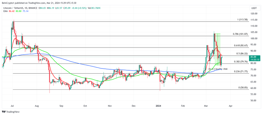 이 글을 쓰는 시점에 85달러에 거래되고 있는 라이트코인의 가격은 50일 지수이동평균(EMA) 바로 아래에 있으며 저항선인 86달러와 일치합니다. 이 가격대는 50% 피보나치 되돌림($113~$58)과 교차하는 지점입니다.
