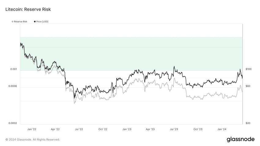 Sponsored투자자의 신뢰도가 높고 가격이 낮을 때 이 지표는 위험/보상이 매력적이라는 것을 나타냅니다. 이는 일반적으로 강세 신호로 간주되며, 추가 성장 가능성을 시사합니다. 현재 라이트코인은 녹색 영역에 있을 뿐만 아니라 실제로 그 아래에 있기 때문에 현재 라이트코인의 상태는 이와 같습니다.