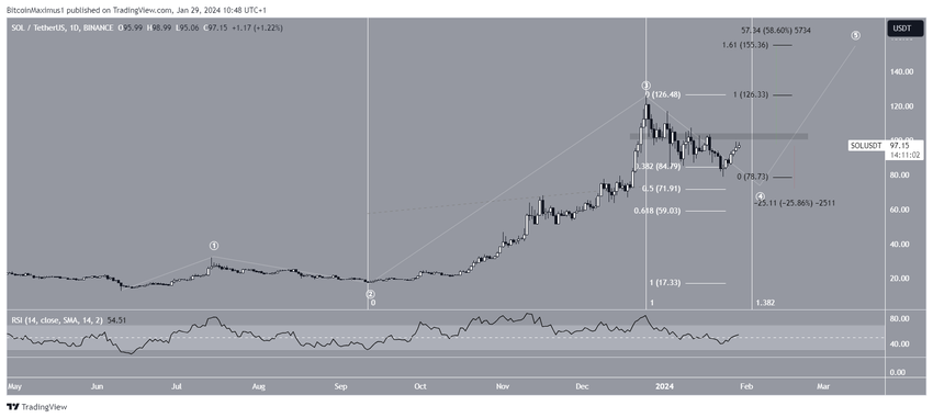 일일 시간대의 기술적 분석에 따르면 SOL은 12월 25일 2023년 최고가인 126달러에 도달한 이후 하락한 것으로 나타났습니다. 하락은 하강 평행 채널 안에 포함되었으며 2024년 1월 23일 78달러로 최저치를 기록했습니다.