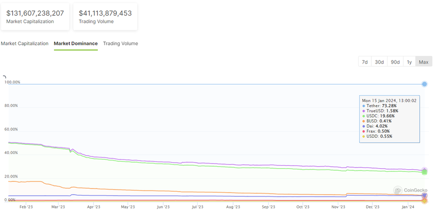 규제 당국의 도전과 조사에도 불구하고 테더의 시장 지배력은 흔들리지 않고 있습니다. 시가총액이 255억 달러에 달하는 가장 가까운 경쟁자인 서클의 USDC 스테이블코인을 크게 압도하고 있습니다.