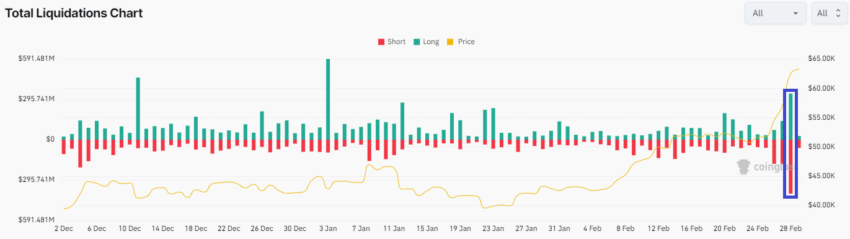 비트코인은 2021년 11월 이후 최고치인 64,000달러까지 치솟았고, 이더리움은 3,500달러에 근접하며 2년 만에 최고치를 기록했습니다. 이러한 급등으로 인해 레버리지 트레이더들이 가격 급등락의 소용돌이에 휘말리면서 8억 달러에 달하는 대규모 청산이 발생했습니다.