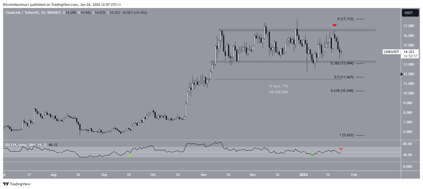 체인링크(LINK) 가격은 2023년 11월 이후 수평 범위 내에서 거래되고 있습니다. 4일 전 박스권 고점에 의해 거부되었습니다.