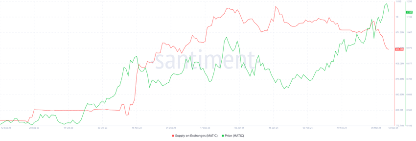 둘째, 폴리곤 네이티브 토큰은 투자자들의 구매가 급증한 것으로 나타났습니다. 모든 거래소의 총 MATIC을 보여주는 거래소 공급량은 지난 한 주 동안 감소했습니다.