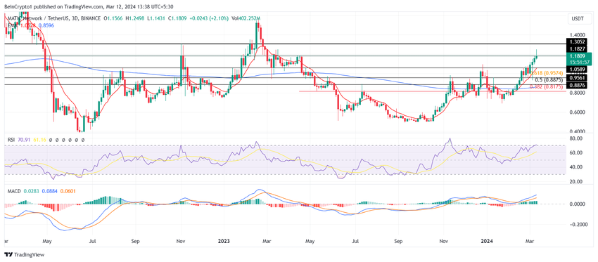 3일 차트의 폴리곤 가격은 지난 48시간 동안약간의 조정을 보이며 지속적인 상승세가 둔화되었습니다. 이 알트코인은 2023년 4월에 마지막으로 테스트한 저항선인 1.18달러에 도달했습니다.