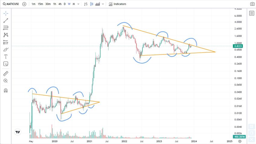 다크 그린은 장기 대칭 삼각형을 트위터에 올렸습니다. 그는 이러한 움직임이 비슷한 패턴에서 벗어난 후 상승을 가속화했던 2021년과 비슷할 것이라고 전망했습니다.