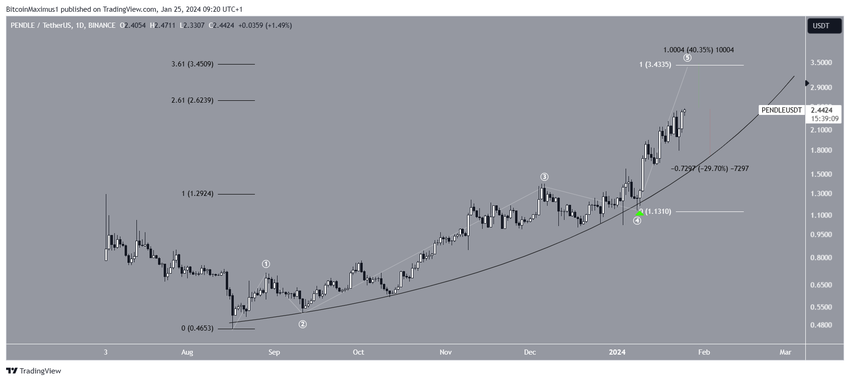 PENDLE 가격은 2023년 8월 이후 포물선형 상승 지지 추세선과 함께 상승했습니다. 이 추세선은 여러 번 검증되었으며, 가장 최근에는 1월 8일에 확인되었습니다(녹색 아이콘). PENDLE은 오늘 사상 최고가인 2.47달러를 기록했습니다.