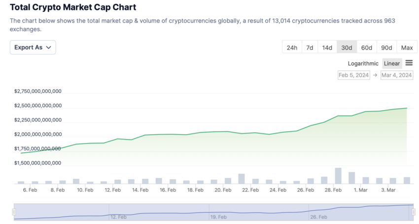 코인게코의 최신 데이터에 따르면 암호화폐 시가총액이 2조 5천억 달러를 넘어섰습니다.