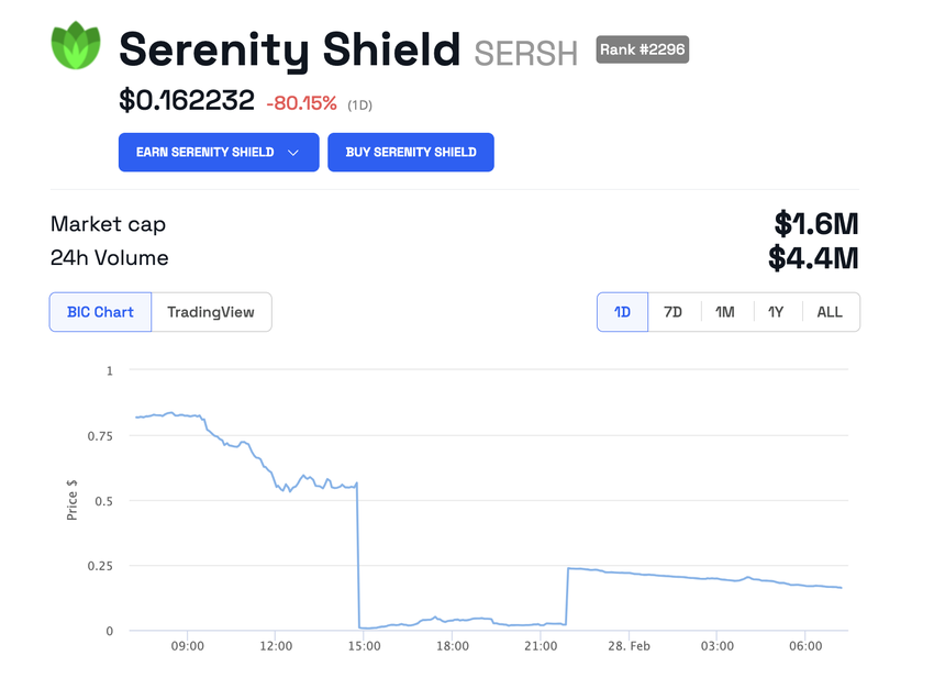 “안전한 개인 데이터 저장” 솔루션으로 유명한 Serenity Shield는 몇 분 만에 토큰인 SERSH가 98%나 폭락했습니다. 이러한 급격한 하락은 560만 달러에 해당하는 약 690만 개의 SERSH 토큰이 팀의 메타마스크 지갑에서 도난당하는 보안 침해가 발생한 후 발생했습니다.