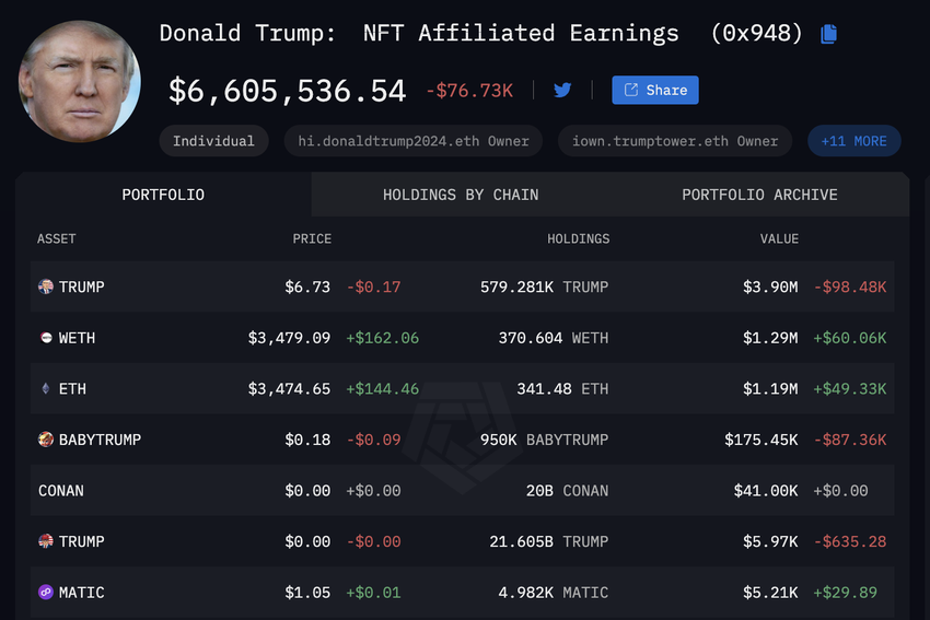 베이비트럼프 토큰은 최근 하락세를 보이고 있지만 여전히 트럼프의 포트폴리오에서 중요한 부분을 차지하고 있으며, 그 가치는 175,450달러에 달합니다. 트럼프는 또한 5,210달러 상당의 폴리곤(MATIC) 토큰을 보유하고 있으며, 이는 광범위한 투자 철학을 보여줍니다.
