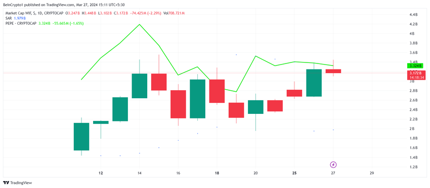 만약 역전된다면, PEPE는 세계에서 3위 밈 코인의 자리를 잃게 되고 WIF가 그 자리를 차지하게 될 것입니다.