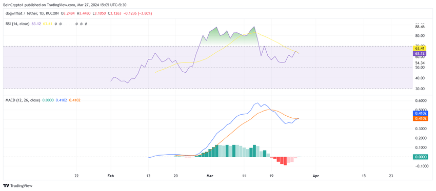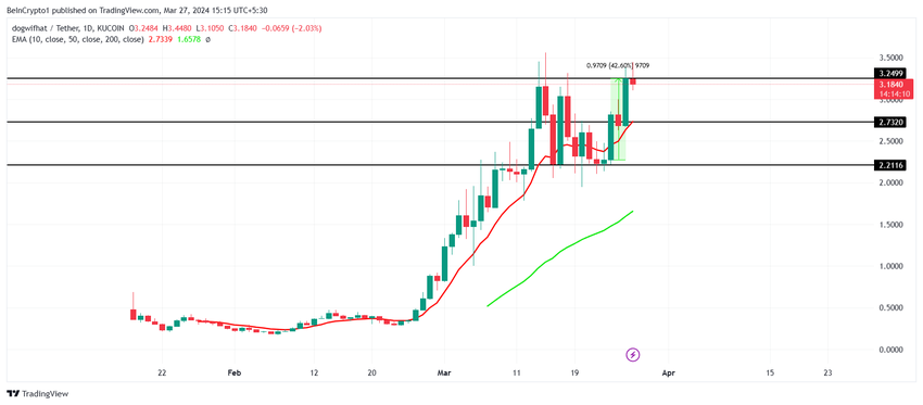 도그위햇 가격은 현재 3.18달러로, 지난 24시간 동안 3.24달러로 사상 최고가를 경신하지 못한 후 하락세를 보이고 있습니다. 강세 모멘텀이 속도를 내고 WIF가 PEPE 코인을 추월한다면 가격 상승이 계속될 수 있습니다.