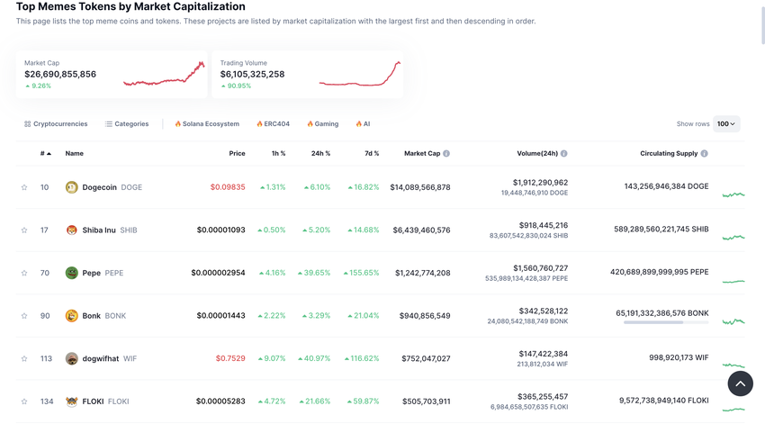 밈 코인의 시가총액은 지난 24시간 동안 9.26% 상승하여 266억 달러에 달했습니다. PEPE와 도그위핫(WIF)이 각각 39.65%와 40.97% 상승하며 이러한 성장을 주도하고 있습니다. 이러한 큰 폭의 상승은 수익성이 높지만 변동성이 큰 암호화폐 산업의 특성을 잘 보여줍니다.