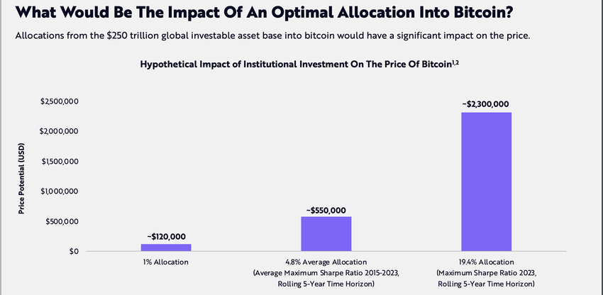 ARK 인베스트의 연구 결과가 시사하는 바는 매우 큽니다. 글로벌 투자 가능 자산에서 비트코인으로 1%만 재분배해도 비트코인 가격이 12만 달러까지 치솟을 수 있습니다. 더 공격적으로 4.8%를 이동하면 가치가 550,000달러까지 치솟을 수 있습니다. 그러나 19.4% 배분 시나리오는 230만 달러의 비트코인 정점을 상상하며 상상력을 자극합니다.