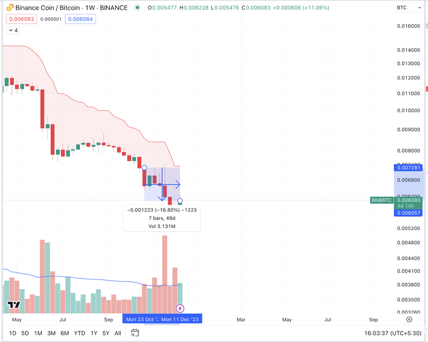 이러한 좌절 속에서 BNB 코인은 대표 암호화폐인 비트코인에 비해 저조한 성과를 보였습니다. 비트코인은 10월 말부터 강한 상승세를 보이고 있지만, 아래 스크린샷은 BNB가 최소 16% 이상 저조한 성과를 보이고 있음을 보여줍니다.