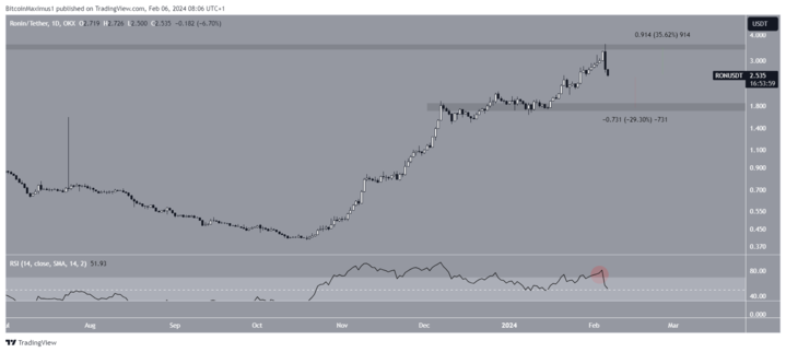 어제 약세장을 감싸는 캔들스틱이 나타났습니다. 하락 추세가 지속되면 RON은 32% 하락하여 가장 가까운 지지선인 1.75달러에 도달할 수 있습니다. 일일 RSI는 70(빨간색 원) 아래로 떨어지고 하락하고 있기 때문에 이러한 하락을 정당화합니다. 이러한 약세 전망에도 불구하고 현재 수준에서 강한 반등이 이뤄진다면 저항선인 3.50달러까지 35% 상승할 수 있습니다.