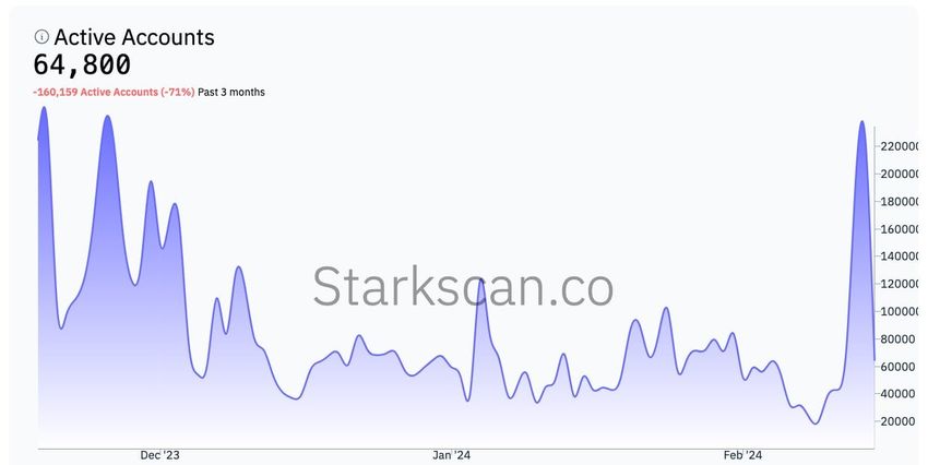 “스타크넷은 다시 유령 체인이 되었습니다. 어제 활성 계정이 22만 6천 개로 정점을 찍었다가 지금은 6만 4천 개로 다시 떨어졌습니다. 이 체인에서 사용자 유지가 가능할지 의문입니다.”라고 온체인 분석가인 Hitesh Malviya는 글을 썼습니다.