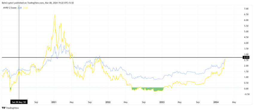 차트에서 볼 수 있듯이, BNB의 MVRV Z-score는 2.73 임계치 돌파를 목전에 두고 있습니다. 이 수준을 돌파하면 암호화폐가 과대평가되었을 가능성이 높으며, BNB가 크게 조정되기 전에 투자자들이 매도할 수 있습니다.