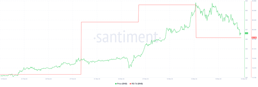 BNB의 상대강도지수(RSI) 는 84로 과매수 범위에 속합니다. 이는 해당 자산이 시장에서 강하게 매수되었으며 현재 고평가되어 있을 수 있음을 의미합니다. 이는 가격 조정 또는 하락 가능성을 높입니다.