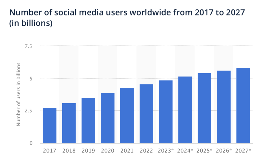 Statista는 2027년까지 전 세계 소셜 미디어 사용자 수가 58억 5,000만 명에 달할 것으로 예측합니다.