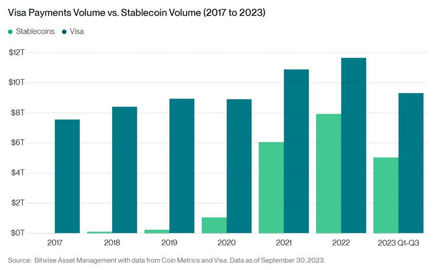 라스무센의 또 다른 대담한 예측은 스테이블코인을 이용한 결제가 비자의 숫자를 앞지를 것이라는 것입니다. 그는 이렇게 믿습니다: