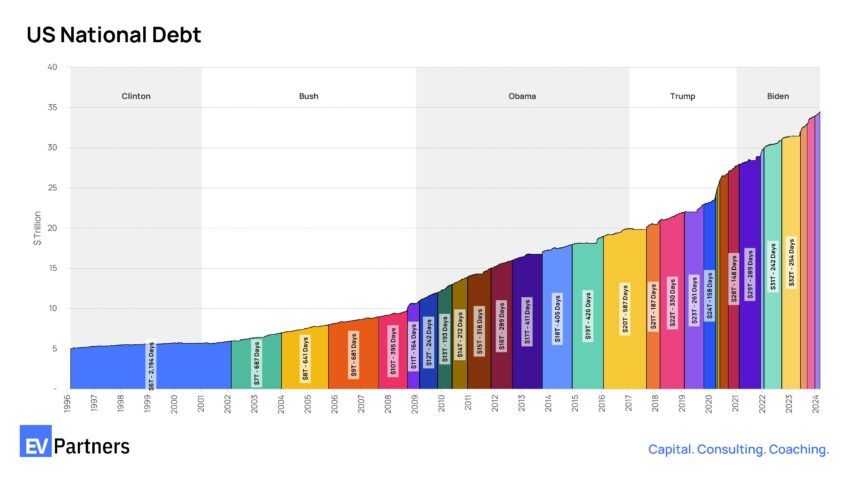 도널드 트럼프 전 대통령과 같은 정치인들이 해결되지 않은 부채의 ‘시한폭탄’에 대해 경고하면서 비트코인을 둘러싼 논의는 새로운 시급성을 띠고 있습니다. 놀랍게도 2023년 10월, 미국의 부채는 하루 만에 2,750억 달러 증가하여 총 33조 4,400억 달러로 사상 최대치를 기록했습니다.