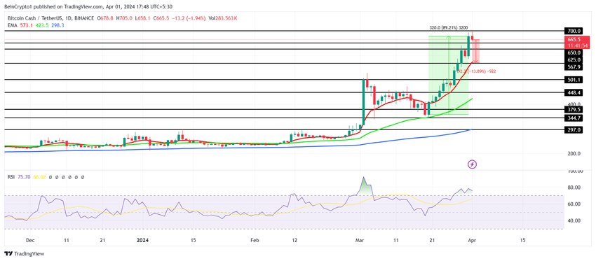 이 지지선을 돌파하면 BCH는 572달러까지 하락할 것이며, 이는 50일 지수이동평균(EMA)과 맞닿아 있어 14% 하락을 의미합니다.