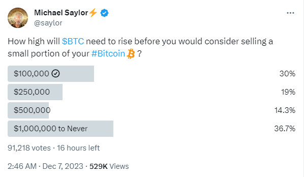 12월 6일, 마이크로스트레티지의 CEO 마이클 세일러는 자신의 300만 팔로워를 대상으로 비트코인이 얼마나 더 올라야 보유 자산의 일부 매도를 고려해야 할지 묻는 설문조사를 실시했습니다.