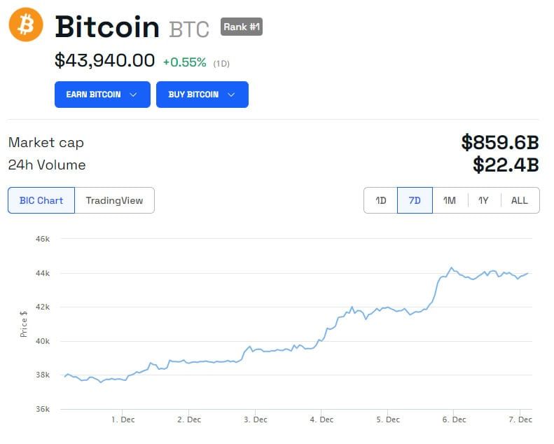 비트코인 가격은 지난 24시간 동안 꾸준한 상승세를 유지하며 최근 상승세를 이어가고 있습니다. 그 결과, 이 글을 쓰는 시점에 현물 시장에서 43,940달러에 거래되고 있습니다.