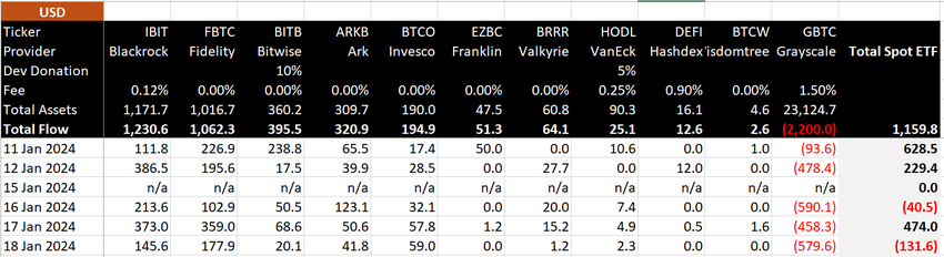 그레이스케일은 2024년 1월 16일에 코인베이스 프라임에 8,730 BTC를 전송했습니다. 나흘 전에 4,100만 달러를 코인베이스 프라임 지갑으로 옮겼는데, 이는 이전 판매에 따른 것일 수 있습니다. 블룸버그의 선임 ETF 애널리스트인 에릭 발추나스(Eric Balchunas)는 2024년 1월 11일에 9,510만 달러, 2024년 1월 12일에 4억 8,400만 달러가 유출된 것으로 추정했습니다.