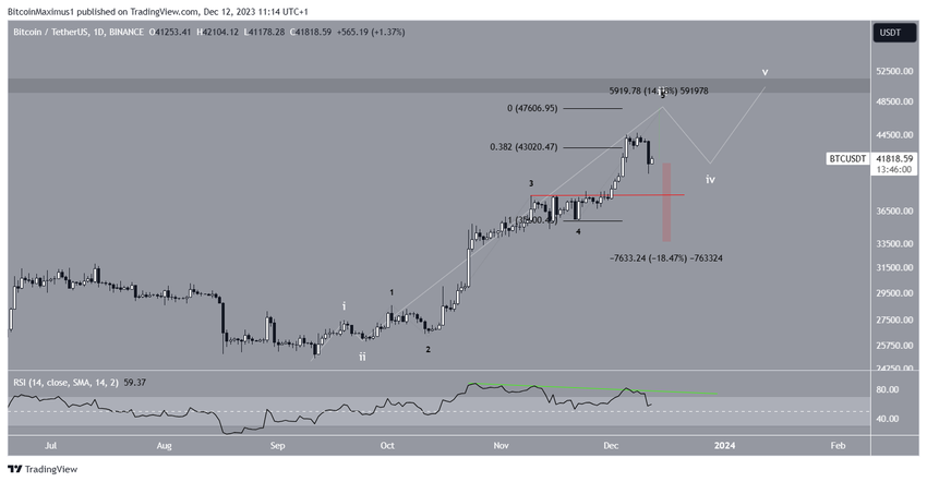 이후 비트코인 가격은 조정 4파를 시작할 수 있습니다. RSI의 약세 다이버전스(녹색)는 상승 움직임이 정점에 가까워지고 있음을 나타냅니다.
