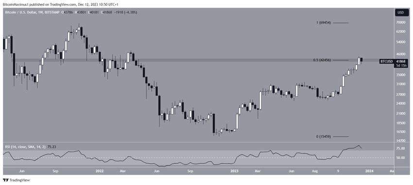 비트코인 주간 차트를 보면 10월 중순 이후 가격이 급격히 상승했으며, 8개의 연속적인 주간 캔들스틱 상승을 확인할 수 있습니다. 지난주 비트코인은 연중 최고치인 44,700달러를 기록했습니다. 이 최고가는 중요한 수평 및 피보나치 저항선 위에서 형성되었습니다.