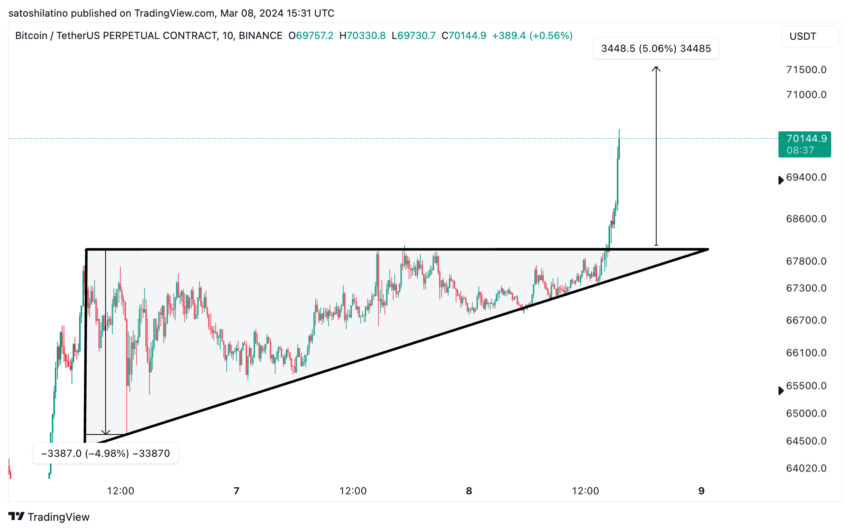 이러한 급등은 비트코인이 10분 차트에서 상승 삼각형을 돌파한 데서 비롯되었습니다. 이 기술적 패턴은 디지털 화폐의 강세 모멘텀을 강조하며 앞으로 더 많은 성장을 암시합니다.