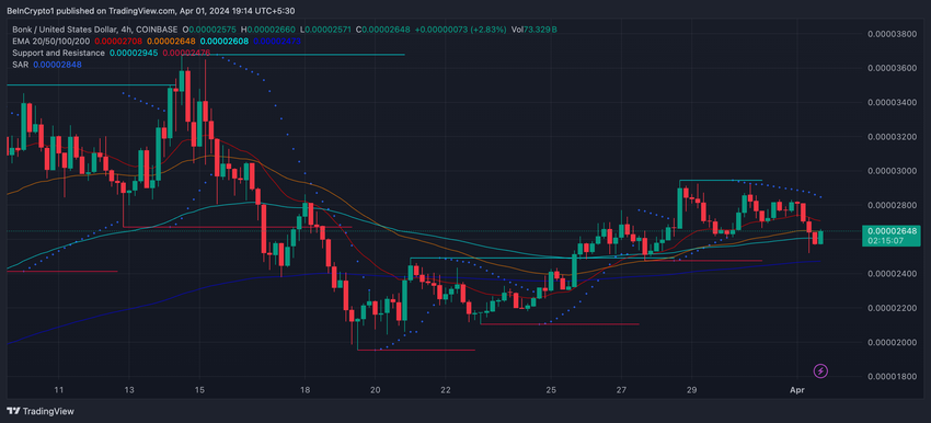 현재 BONK는 $ 0.000024 및 $ 0.000021에서 중요한 지원 수준에 직면하고 있습니다. 이 수준 이상을 유지하면 가격이 안정화되어 큰 하락을 방지할 수 있습니다.