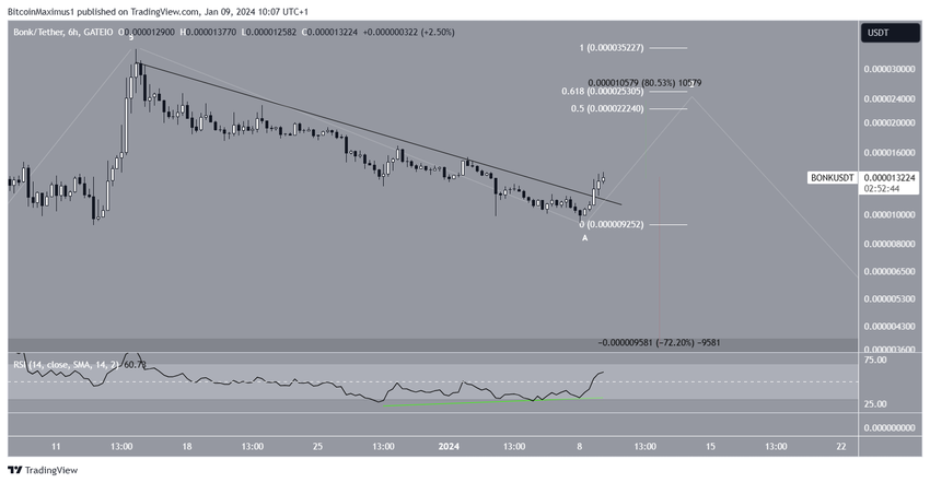 이러한 하락에도 불구하고 BONK는 오늘 단기 하강 저항 추세선을 돌파했습니다.