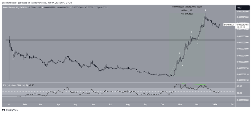 가장 가능성이 높은 파동 수는 BONK가 10월 저점 이후 5개의 파동 상승을 완료했음을 시사합니다.